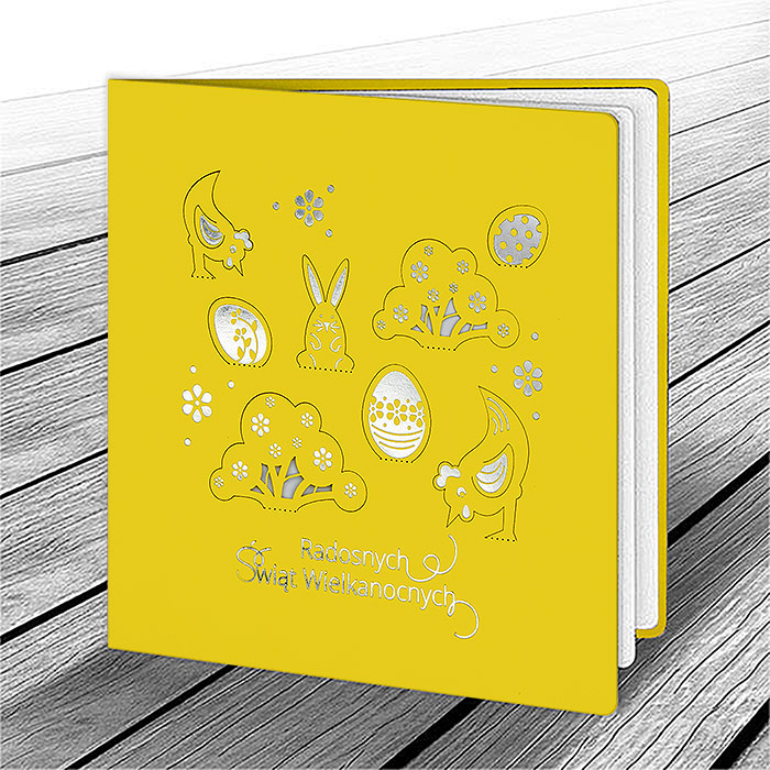 Wyjątkowa kartka wielkanocna wykonana z matowego papieru w intensywnym, żółtym kolorze, który wnosi energię i wiosenną świeżość. Wyrazista barwa okładki stanowi idealne tło dla dekoracyjnych detali, tworząc pogodny i optymistyczny charakter projektu.