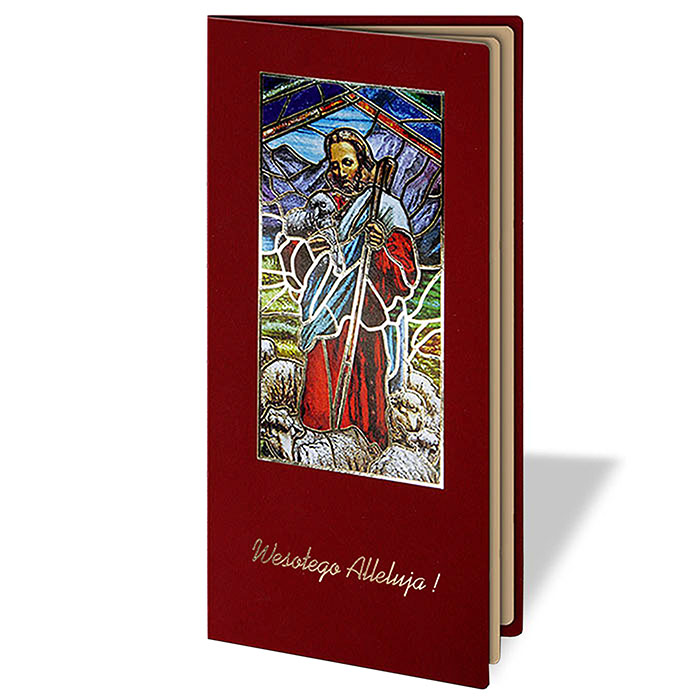 Centralną część okładki zdobi pionowe okienko, przez które widoczna jest kolorowa grafika religijna inspirowana stylistyką witrażu. Przedstawia ona Jezusa jako Dobrego Pasterza, otoczonego owcami, na tle górskiego pejzażu. Bogactwo barw i detali nadaje kompozycji głębi oraz wyjątkowego, świetlistego charakteru. Motyw wykonany został innowacyjną techniką druku, dodatkowo wzbogaconą hot-stampingiem w kolorze złotym, który subtelnie podkreśla wybrane elementy grafiki. Całość dopełnia elegancki, złocony napis "Wesołego Alleluja!" umieszczony na okładce. Wnętrze kartki stanowi metalizowana wkładka w kolorze beżowym, przeznaczona do nadruku treści życzeń oraz logotypu.