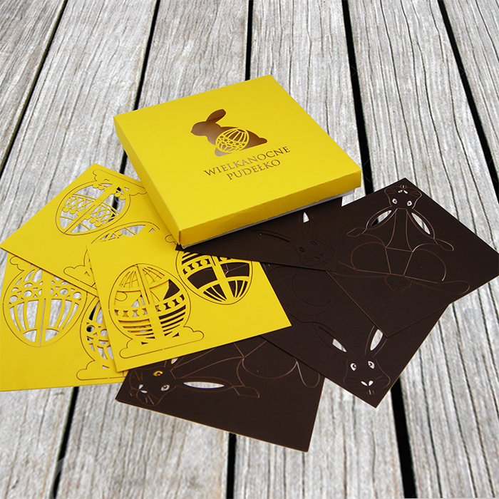 Wewnątrz pudełka umieszczony jest komplet papierowych dekoracji wielkanocnych wykonanych techniką cięcia laserowego. Zestaw zawiera przestrzenne jajka 3D oraz zajączki, które po złożeniu mogą pełnić funkcję winietek na stół - z dołączoną kartką na imię gościa - lub drobnych dekoracji stołu świątecznego, biurka w firmie czy recepcji.