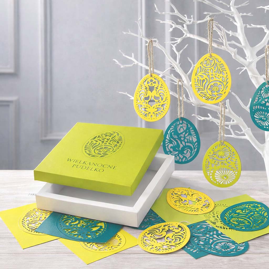 Wewnątrz znajduje się komplet papierowych aplikacji w formie jajek-pisanek, wykonanych techniką precyzyjnego cięcia laserowego. Ażurowe wzory inspirowane motywami roślinnymi i ludowymi sprawiają, że dekoracje są lekkie wizualnie i eleganckie. Pisanki mogą być zawieszone na żyłce lub nitce - w oknie, na gałązce, na dekoracyjnym drzewku lub jako subtelna ozdoba przestrzeni biurowej, recepcji czy domu.