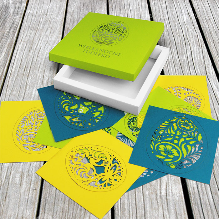Pudełko wykonane jest z wysokiej jakości papieru barwionego w masie, o gładkiej, matowej powierzchni, w świeżej, wiosennej kolorystyce zielono-żółtej. Wieczko zdobi precyzyjnie wycięty laserowo motyw jajka -pisanki - delikatny, ażurowy wzór nadaje całości dekoracyjny charakter.