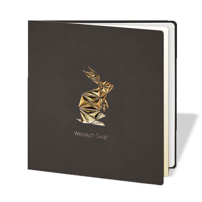 Okładka wykonana została z wysokiej jakości matowego papieru o gumowej strukturze w głębokim brązowym kolorze. Centralnym elementem projektu jest trójwymiarowy motyw geometrycznego zajączka wielkanocnego, wykonany techniką hot-stampingu złotą folią. Złocenie pięknie kontrastuje z matową powierzchnią papieru, nadając kartce eleganckiego i nowoczesnego charakteru. Wnętrze uzupełnia matowa wkładka w kolorze ecru, stanowiąca harmonijne tło dla wielkanocnych życzeń.