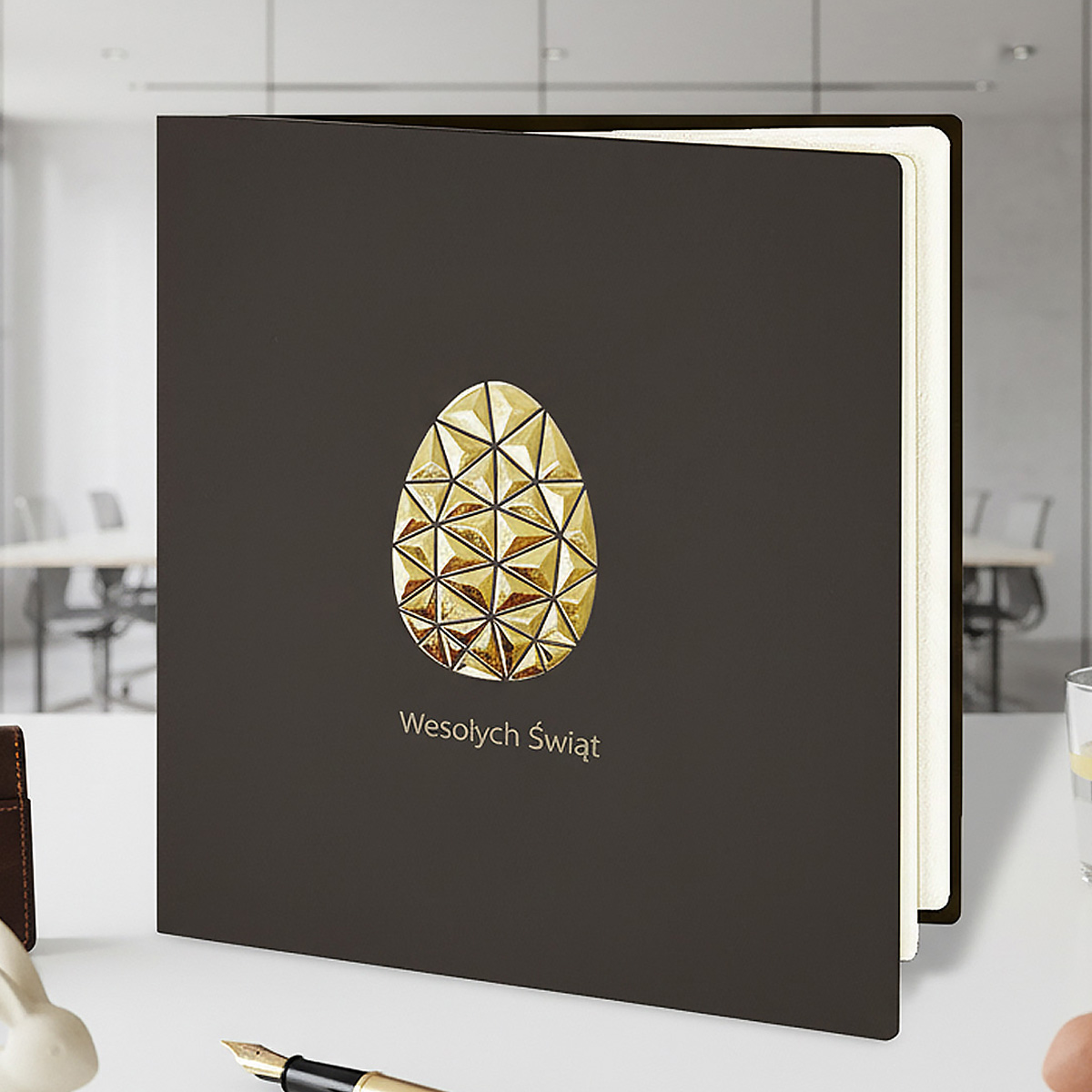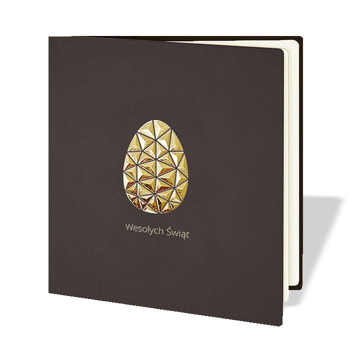 Centralnym elementem kompozycji jest trójwymiarowy motyw jajka wielkanocnego wykonany techniką hotstampingu złotą folią. Geometryczny wzór pisanki subtelnie odbija światło, tworząc efekt głębi i luksusowego połysku. Całość dopełnia delikatny napis "Wesołych Świąt", który harmonijnie współgra z eleganckim charakterem kartki. Wkładka w kolorze ecru stanowi jasne, klasyczne tło dla życzeń.