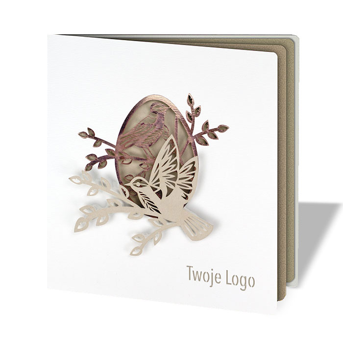 Centralnym elementem kompozycji jest miedziane jajko z precyzyjnie wyciętym laserowo motywem ptaszka na gałązce. Zastosowana aplikacja tworzy efekt trójwymiarowości, nadając kartce lekkości i artystycznego wyrazu. Całość zachwyca finezją wykonania oraz harmonijnym połączeniem faktur i kolorów. Wkładka do nadruku wykonana jest z matowego papieru w odcieniu beżu, idealnego jako tło dla wielkanocnych życzeń.
