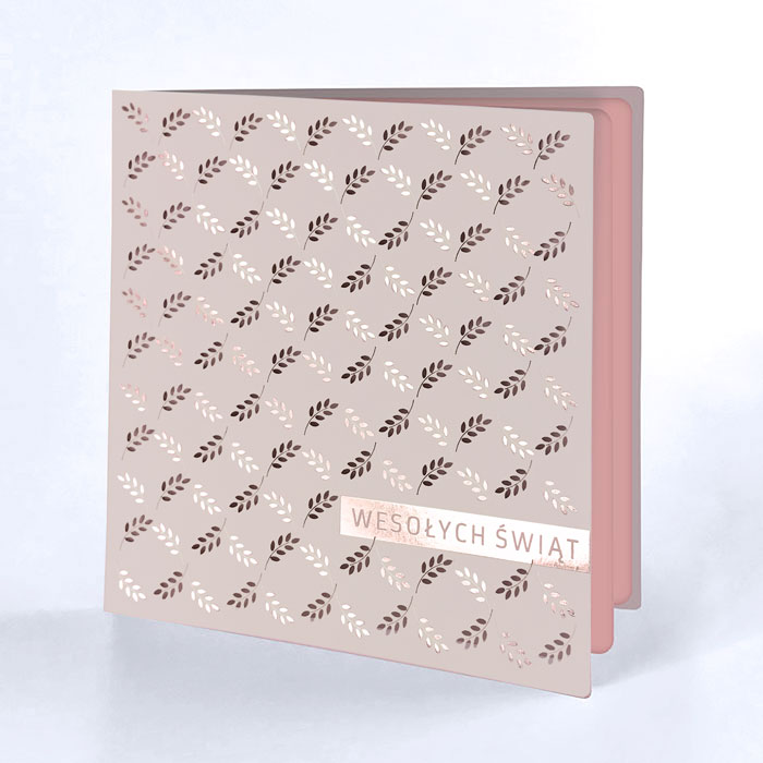 Okładka wykonana została z wysokiej jakości matowego papieru w kolorze pudrowego różu. Całą powierzchnię zdobi powtarzalny, roślinny wzór wykonany techniką hot-stampingu oraz precyzyjnego cięcia laserowego, co nadaje kartce eleganckiej struktury i subtelnego blasku. Delikatnie wkomponowany napis "Wesołych Świąt" dopełnia kompozycję i podkreśla świąteczny charakter projektu. Wnętrze kartki uzupełnia matowa wkładka w kolorze brudnego różu, harmonijnie współgrająca z barwą okładki.