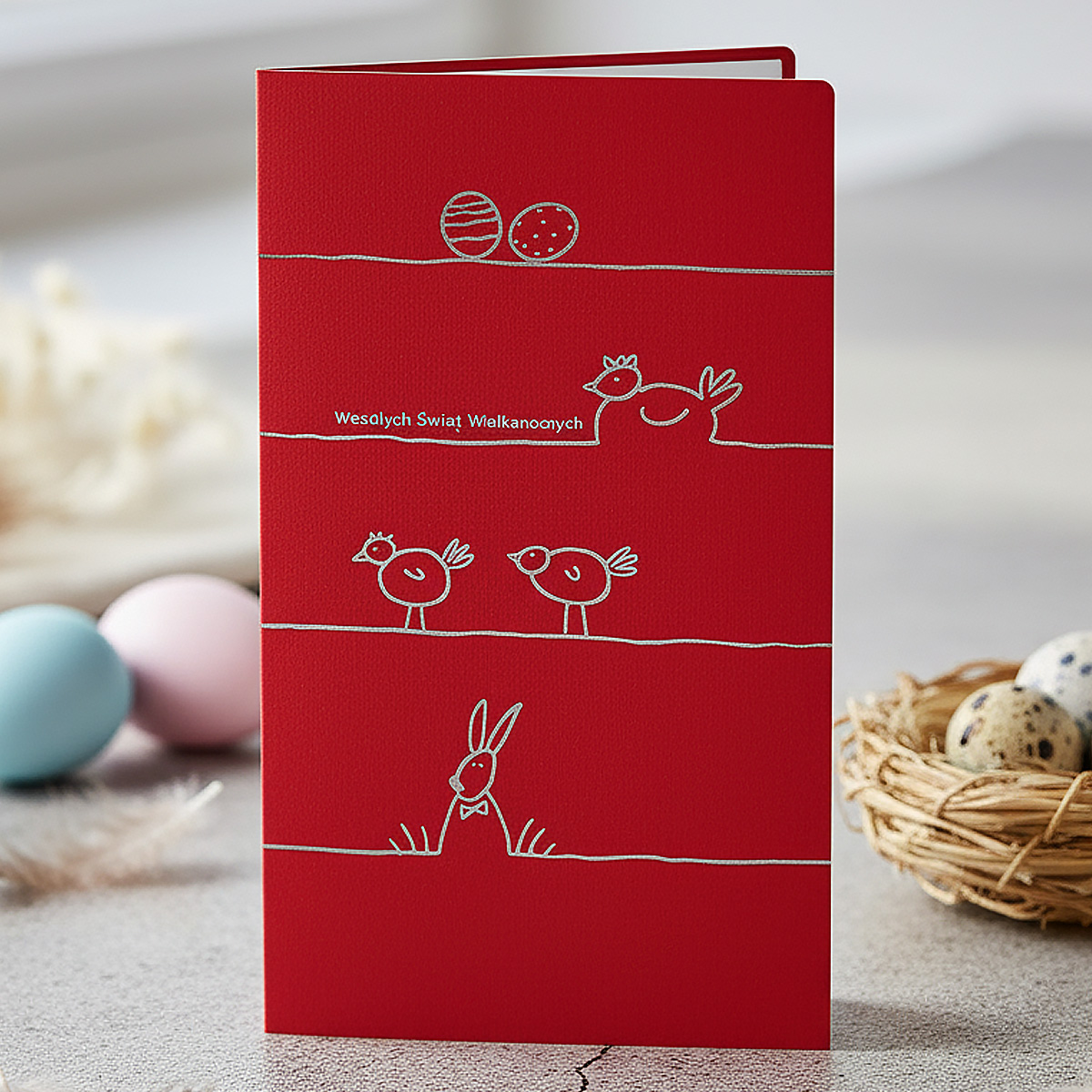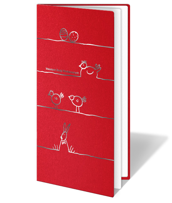 Okładka została wykonana z wysokiej jakości metalizowanego papieru w głębokim, czerwonym kolorze. Jej powierzchnię zdobią wysrebrzone, minimalistyczne motywy wielkanocne - subtelne rysunki jajek, ptaszków i zajączka, rozmieszczone na delikatnych liniach. Srebrne zdobienia pięknie kontrastują z ciepłą czerwienią papieru, nadając kartce nowoczesny i lekki charakter.