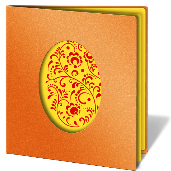 Okładka została wykonana z metalizowanego papieru w intensywnym, pomarańczowym odcieniu. Centralnym elementem kompozycji jest wycięte okienko w kształcie jajka, przez które widoczny jest nadrukowany na pierwszej stronie wkładki wielkanocny motyw pisanki. Takie rozwiązanie nadaje kartce głębi i subtelnego efektu warstwowości, podkreślając jej nowoczesny charakter.