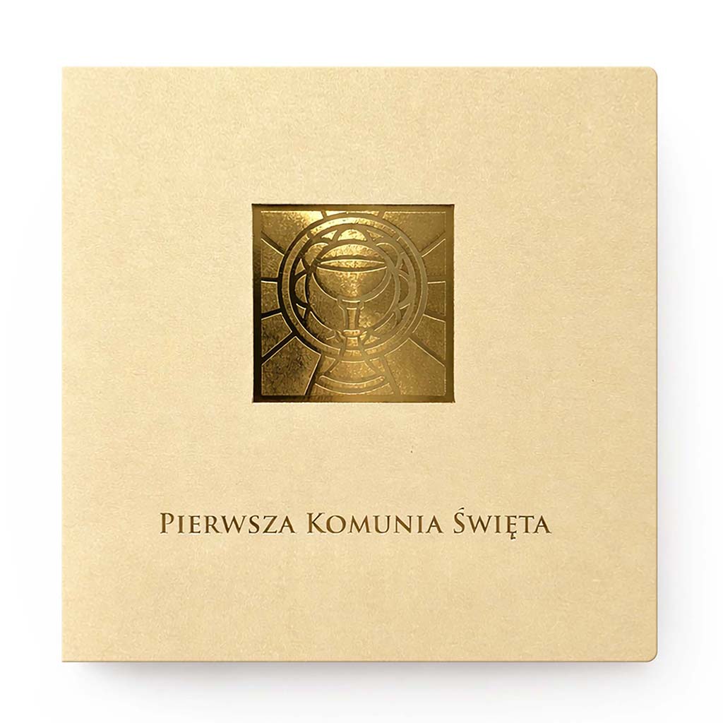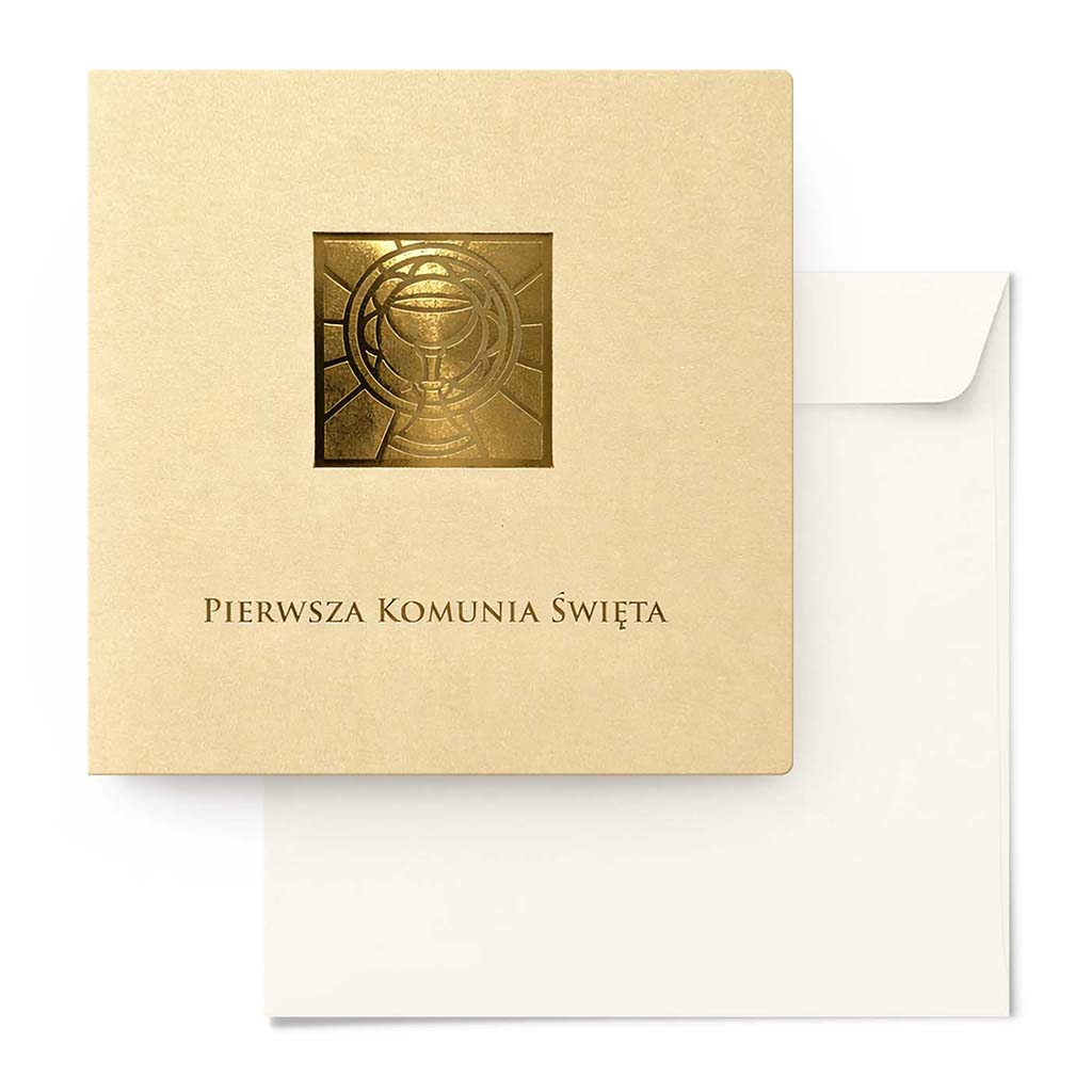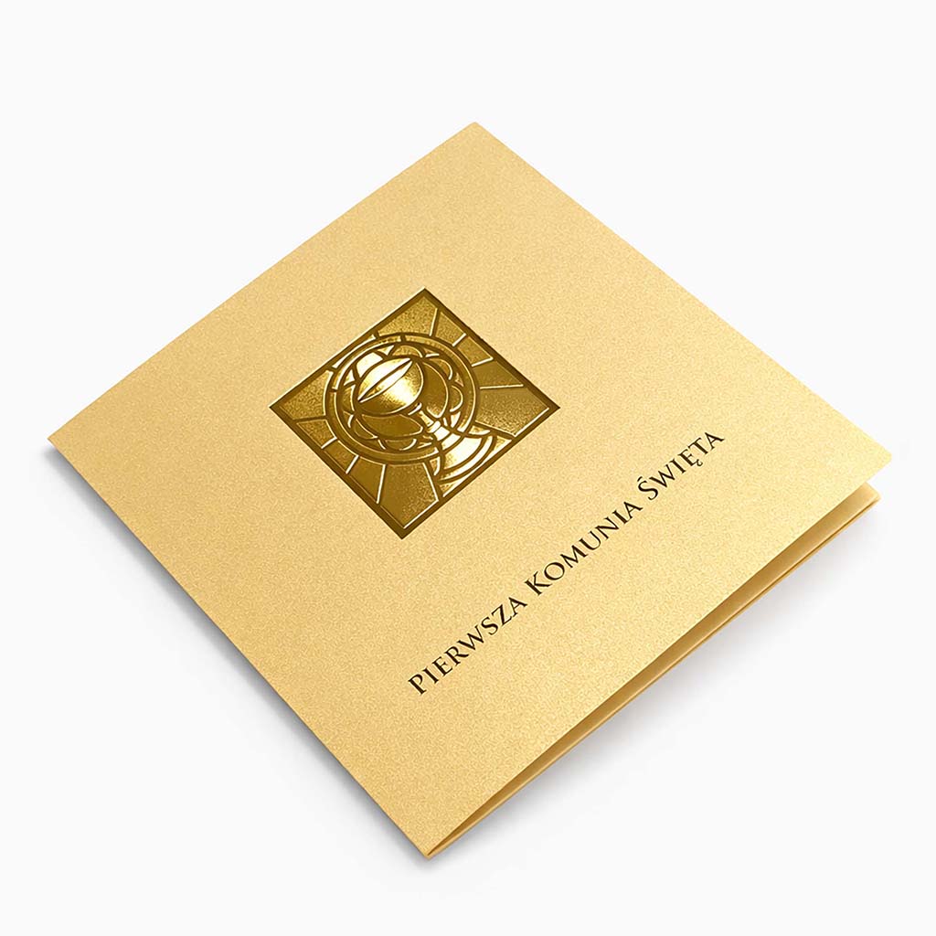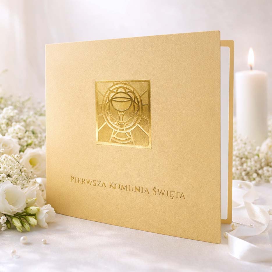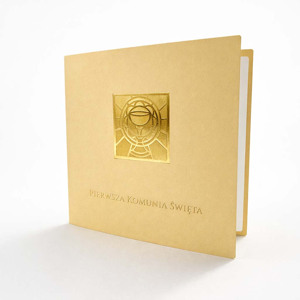 Centralnym elementem projektu jest strukturalny motyw kielicha z hostią wykonany techniką złocenia na gorąco. To nie jest zwykły nadruk - złocenie ma wyczuwalną strukturę i pięknie odbija światło, dzięki czemu zaproszenie prezentuje się wyjątkowo elegancko i dostojnie.