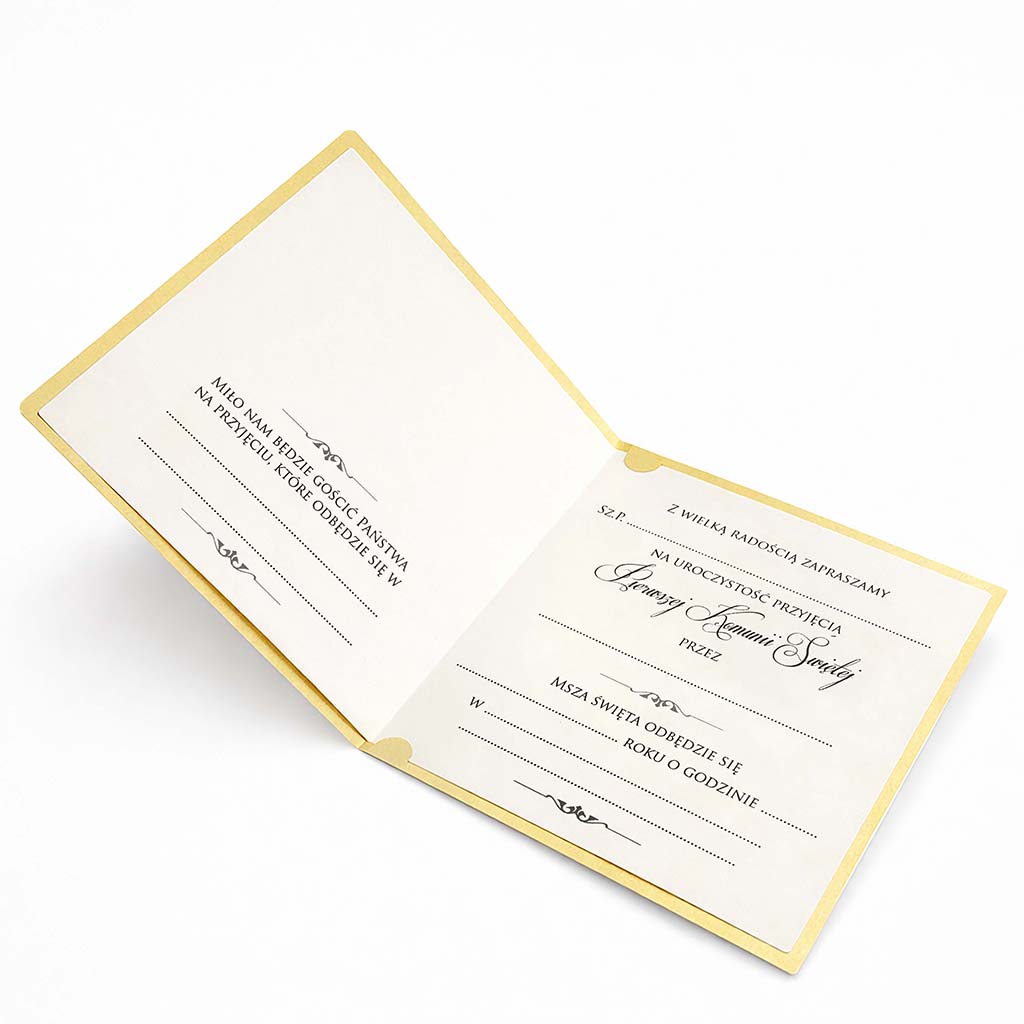 Elegancki komplet 10 zaproszeń komunijnych do samodzielnego wypisania, wykonanych z najwyższej jakości metalizowanego papieru w subtelnym, szlachetnym odcieniu ecru. Delikatny połysk okładki podkreśla prestiż zaproszenia i nadaje mu uroczysty charakter.
