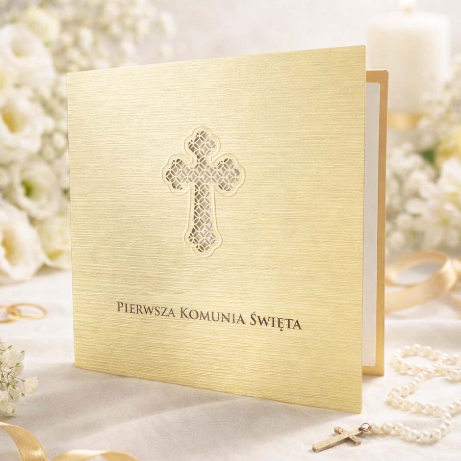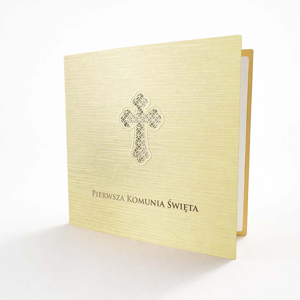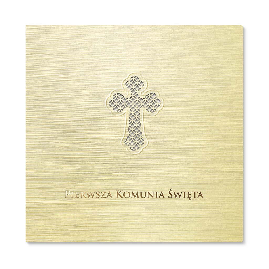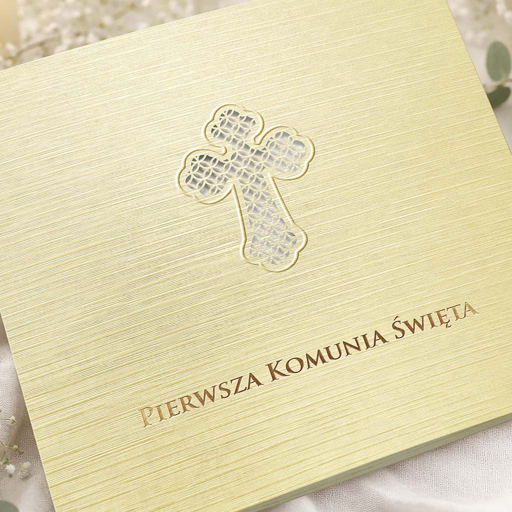 Okładka wyróżnia się subtelną, liniową strukturą papieru, która pięknie pracuje ze światłem i nadaje całości ekskluzywnego charakteru. Centralnym elementem jest precyzyjnie wycięty laserowo ażurowy krzyż z delikatnym tłoczeniem na krawędziach. To detal, który robi różnicę - elegancki, symboliczny i ponadczasowy.