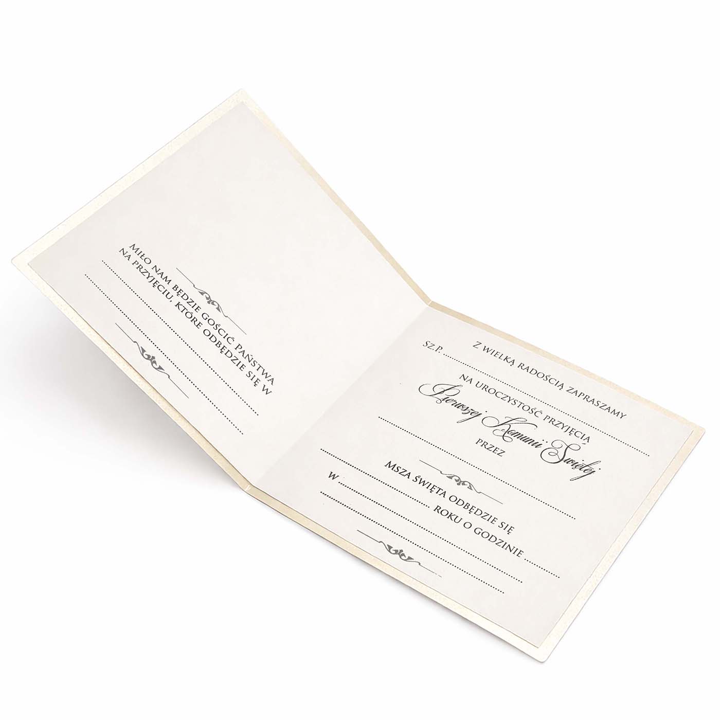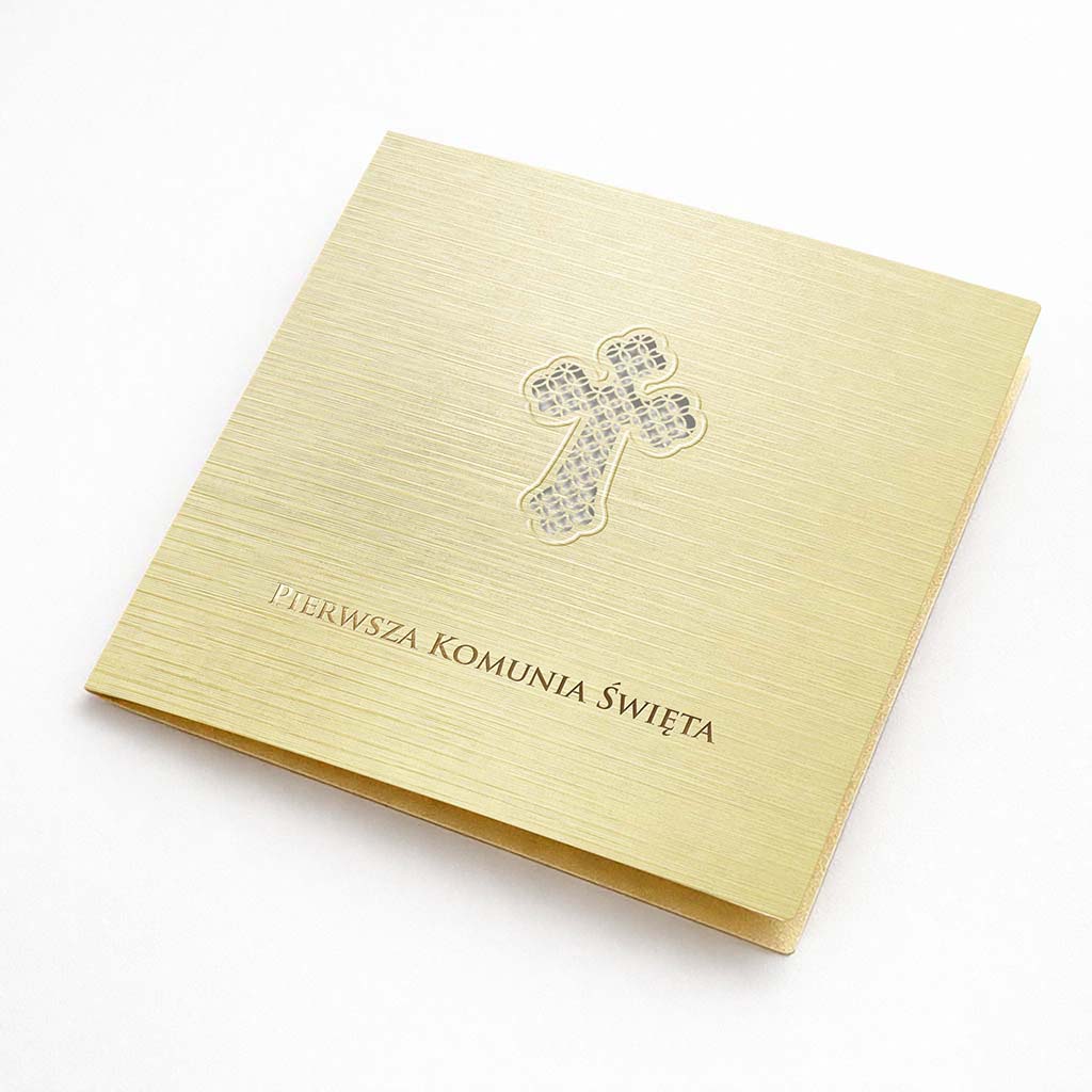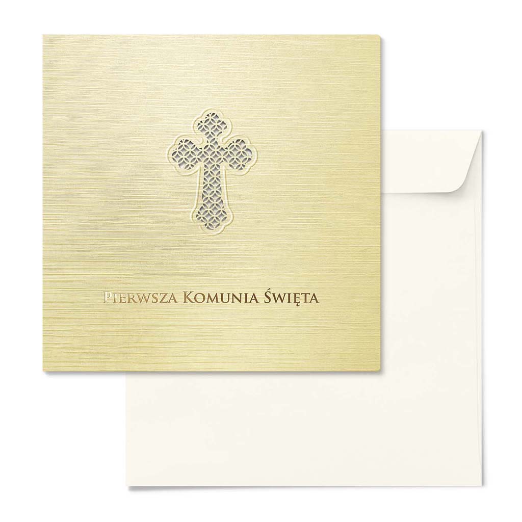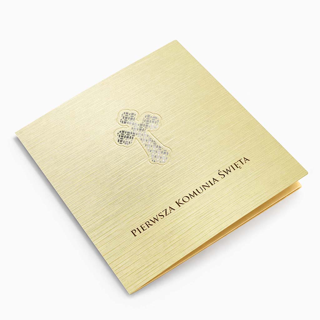 Elegancki komplet 10 zaproszeń komunijnych do samodzielnego wypisania, wykonanych z wysokiej jakości metalizowanego papieru w odcieniu ecru. Klasyka w najlepszym wydaniu - stonowana kolorystyka, szlachetna faktura i dopracowane detale.