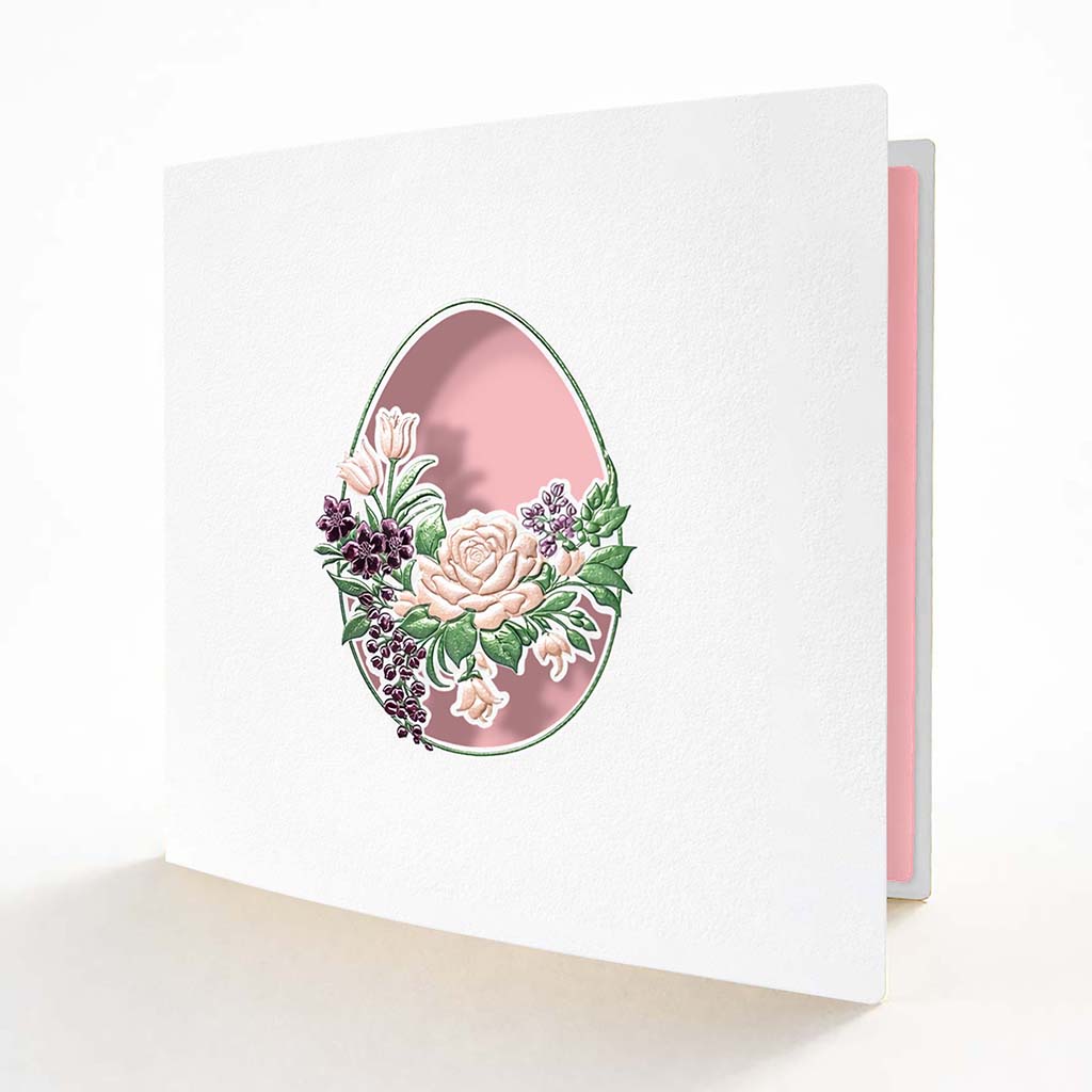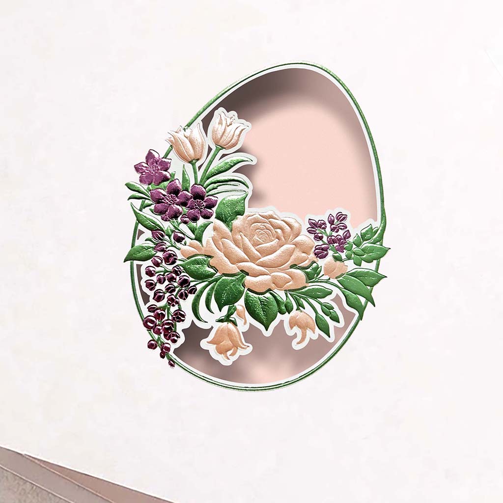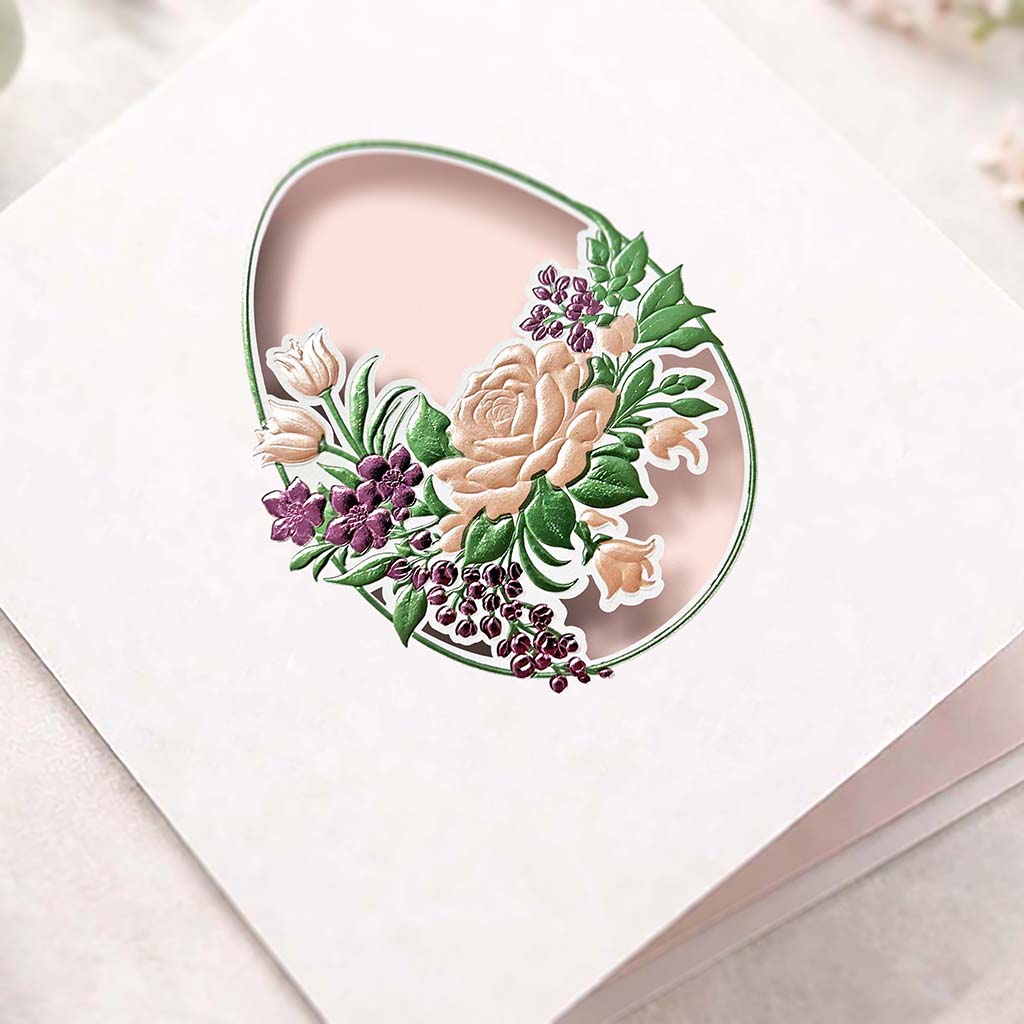 Okładka wykonana została z wysokiej jakości białego papieru matowego o subtelnej, eleganckiej fakturze. Centralnym elementem jest owalne wycięcie w kształcie pisanki, wykonane z niezwykłą precyzją techniką cięcia laserowego. W jego wnętrzu znajduje się bogaty, florystyczny motyw opracowany przy użyciu trójwymiarowej matrycy, która nadaje kompozycji wyraźną głębię i efekt przestrzenności.
