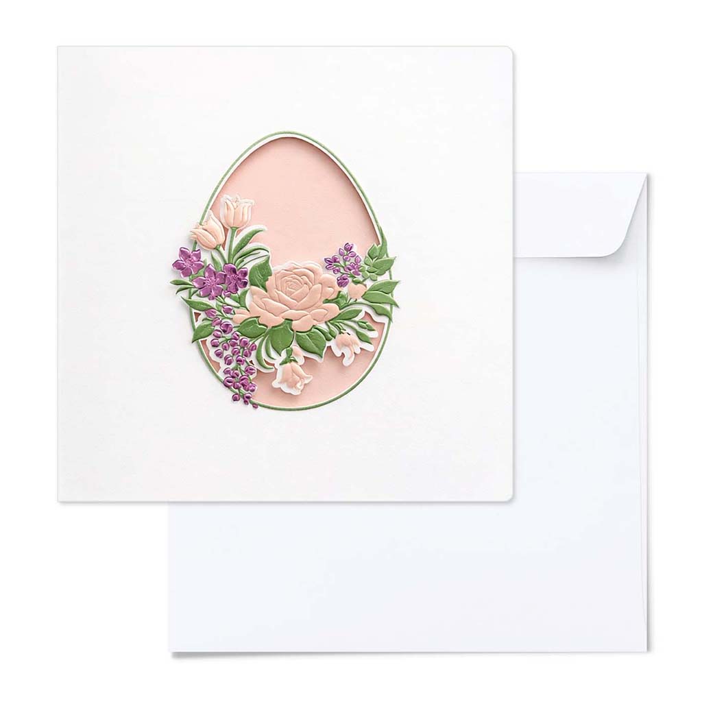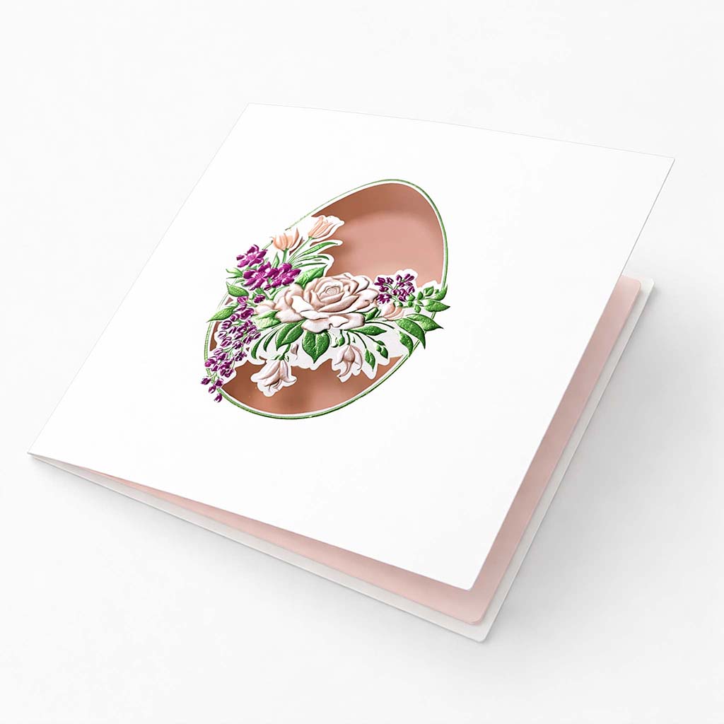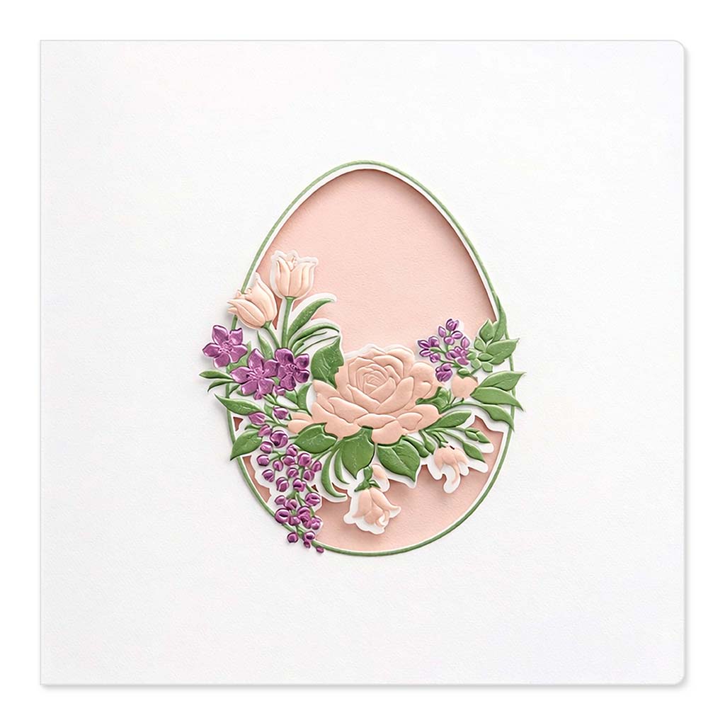 Okładka wykonana została z wysokiej jakości białego papieru matowego o subtelnej, eleganckiej fakturze. Centralnym elementem jest owalne wycięcie w kształcie pisanki, wykonane z niezwykłą precyzją techniką cięcia laserowego. W jego wnętrzu znajduje się bogaty, florystyczny motyw opracowany przy użyciu trójwymiarowej matrycy, która nadaje kompozycji wyraźną głębię i efekt przestrzenności.