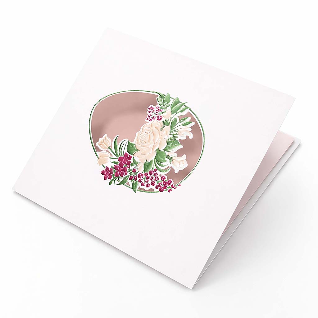 Wnętrze dopełnia jasnoróżowa wkładka z papieru barwionego w masie, o matowym wykończeniu. Jej spokojny, pastelowy odcień harmonijnie współgra z bielą okładki oraz florystycznym motywem, tworząc spójną, elegancką całość. Wkładka przeznaczona jest do nadruku życzeń lub logotypu.